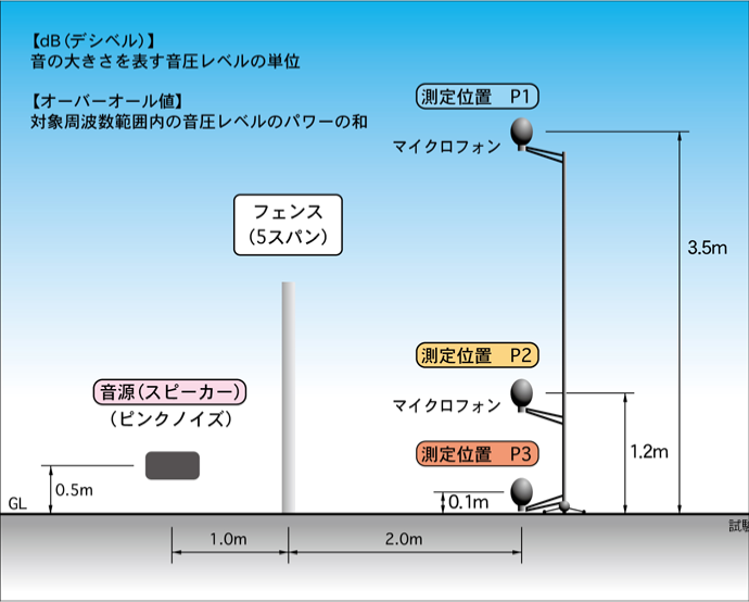 ブラインド・ パネル | 規格 | 測定位置 | フェンス設置前 オーバーオール値 [dB] | フェンス設置後 オーバーオール値 [dB] | 遮音効果 [dB] |