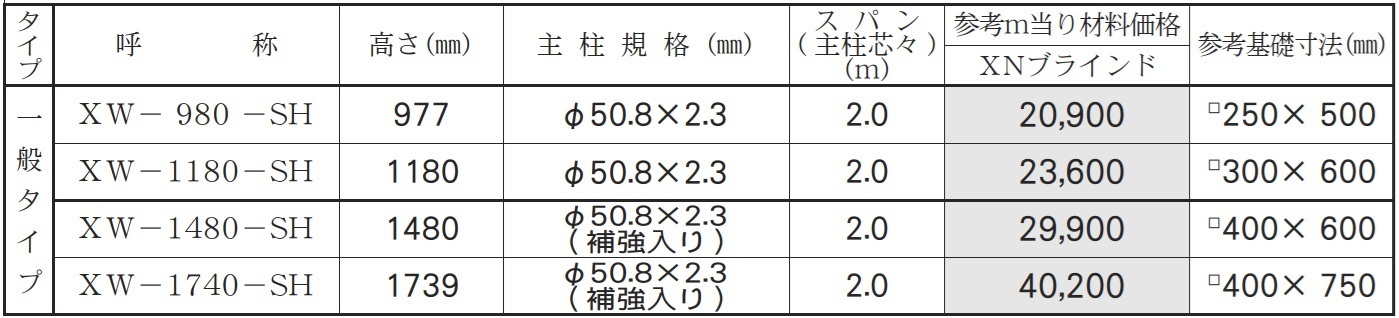 呼称\寸法 | 高さ (mm) | 主柱(mm) | パネル幅 (mm) | 単位質量 (kg/m) | 参考基礎寸法 (mm) | ||