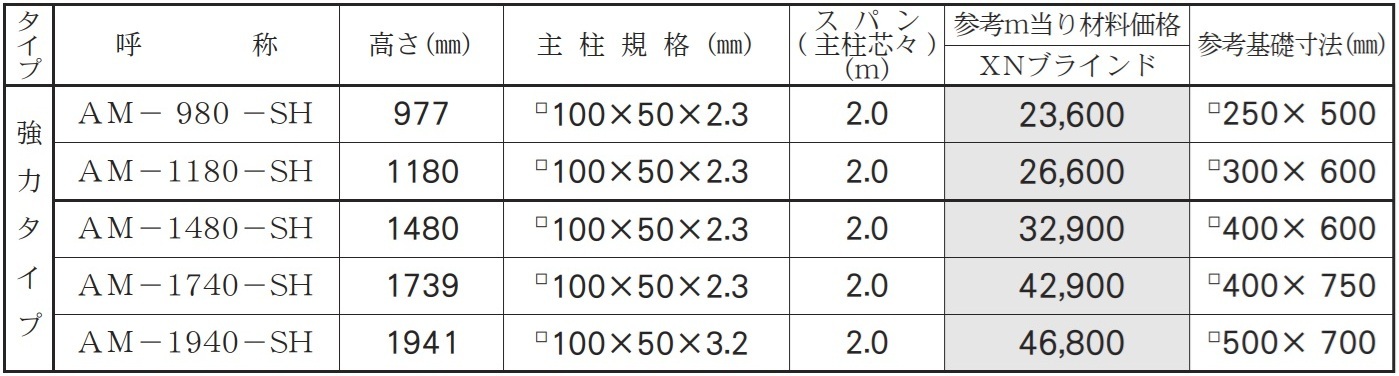 呼称\寸法 | 高さ (mm) | 主柱(mm) | パネル幅 (mm) | 単位質量 (kg/m) | 参考基礎寸法 (mm) | ||