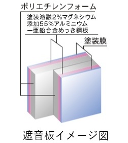 遮音パネルは制震効果のあるポリエチレンフォームを塗装溶融2%マグネシウム添加55%アルミニウム-亜鉛合金めっき鋼板で挟み込んだ3重構造で遮音効果の高いSGパネルをご用意しています。