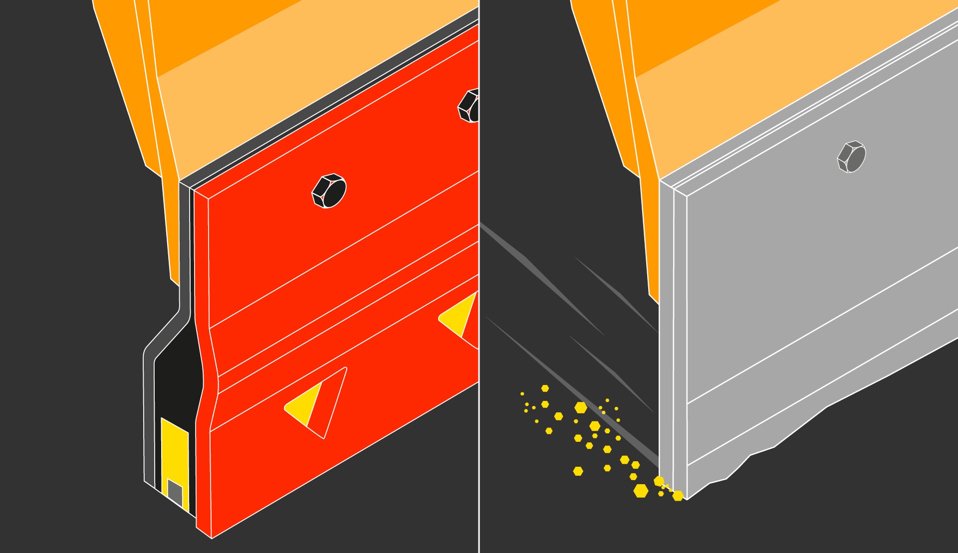 この特殊な耐摩耗鋼は、水焼入れによって400ブリネル硬度を持ち、引張強度は約1,350 N/mm²に達します。最も過酷な作業条件にも耐える優れた性能を発揮します。
