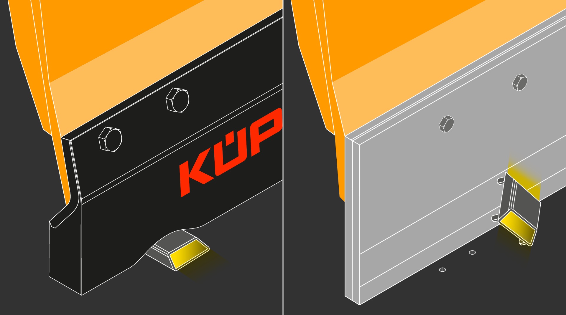 鋼製の取付けネックは、ブレードを除雪車に確実かつ安定して固定するためのもので、この容易に取り付け可能なブレードが折れ曲がるのを防ぎます。