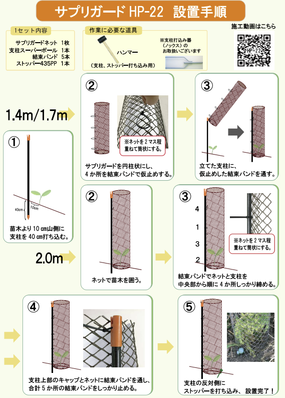 | HP-22 1.4m高 風雪用HP-22 1.7m高 風雪用HP-22 2.0m高 風雪用HP-6 1.7m高 風雪用HP-6 2.0m高 風雪用 | サプリガードネットx1枚支柱スーパーポールx1本結束バンドx5本ストッパー435PPx1本 |